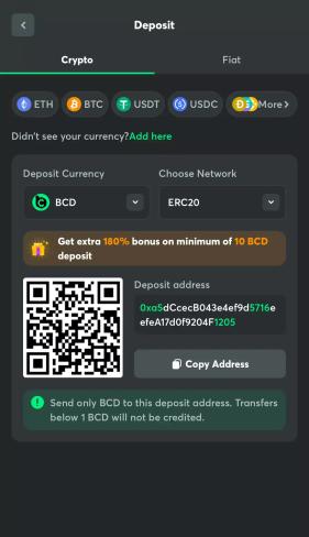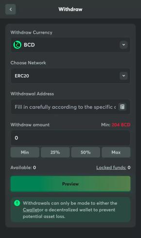 For å sette inn eller ta ut penger må du gå tilbake til kontoen din og klikke på knappen Innskudd eller uttak. Der vil du først se hvilke kryptovalutaer som er tilgjengelige for innskudd og uttak, sammen med instruksjoner om hvordan du går frem.