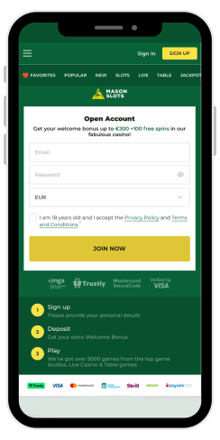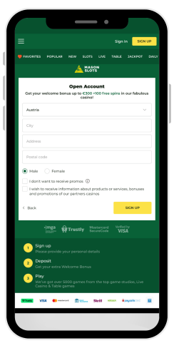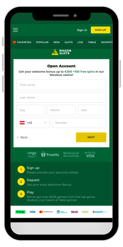 Registreringen på nettstedet er rask og enkel. Det tok meg bare noen få minutter. Du må oppgi informasjon i flere trinn for å logge inn på Mason Slots casino og for senere verifisering.