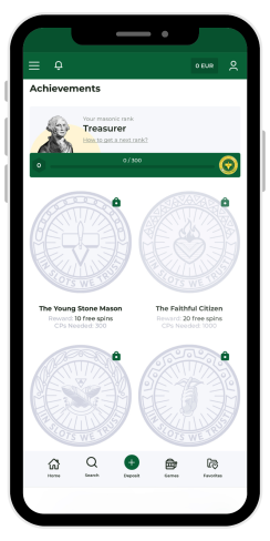 Mason Slots-kasinoets VIP-program er strukturert som 20 prestasjoner. Når spilleren når hver av dem, mottar spilleren belønninger i form av gratisspinn og bonuspenger. På det høyeste nivået (nivå 20) er belønningen en reise til frimureriske steder. For å låse opp Achievements må spillerne samle Comp Points. Du kan få 1 CP per 10 NOK i spill. For eksempel, for å oppnå den første prestasjonen, The Young Stone Mason, må du samle 300 CP, noe som betyr 3,000 NOK i innsatser. Etter min mening har casinoet et gjennomsiktig og rettferdig VIP-program sammenlignet med andre nettsteder.