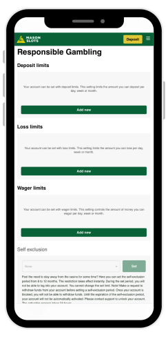 Et bredt utvalg av verktøy for ansvarlig spilling - Mason Slots casino tilbyr et omfattende sett med begrensninger og selvkontrollfunksjoner, noe som viser at casinoet virkelig prioriterer spillernes sikkerhet og ansvarlige atferd.
