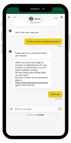 Mens jeg forberedte denne anmeldelsen av Mason Slots, innså jeg at den raskeste måten å få svar fra kundestøtte på er via live chat. En agent kobler seg til umiddelbart og svarer veldig raskt. Jeg synes dette er veldig godt utformet for et internasjonalt publikum.