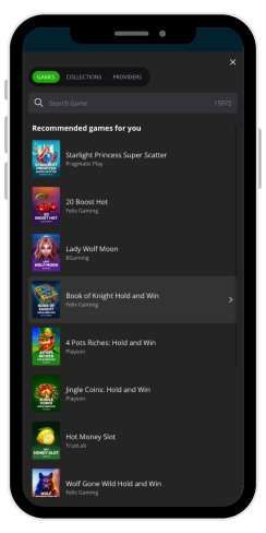Spillkatalogen er enkel å navigere. Det er mulig å søke etter spilltittel, leverandører og samlinger. Blant samlingene er: Nye, Daglige Drops & Gevinster, Øyeblikkelige gevinster, Rulettspill, Pokerspill, Bonuskjøp, Live Casino, Baccarat, Toppspill, Spilleautomater, Bingo, Blackjack, Gameshows og Bitcoin-spill. Det finnes også samlinger som spillerne kan opprette selv: Mine favoritter og Nylig spilt.