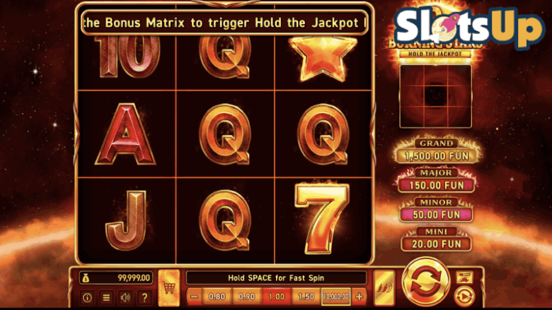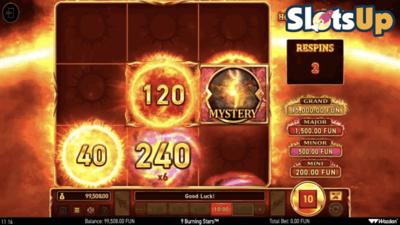 Når du spiller 9 Burning Stars, vil du se at det dukker opp flere symboler på hjulene. Dette er brennende soler med tall på. Dette lagres i bonusmatrisen, som du finner øverst til høyre på spillskjermen. Når denne er fylt, aktiveres Hold the Jackpot-bonusrunden.Alle lagrede solsymboler akkumuleres til én verdi og vises på det midterste hjulet under funksjonen. Du får deretter 3 respins, og hvis flere soler lander, fester de seg og tilbakestiller respins-telleren til 3. Mini-, Minor- og Major-jackpotsymboler kan også lande og gjøre det samme. Disse tildeler deg også den tilsvarende jackpoten.Mystery-symbolet kan også forvandles til et hvilket som helst annet bonussymbol i løpet av denne runden . Jackpot Mystery-symbolet forvandles til ett av de tre jackpot-symbolene.Denne runden avsluttes når alle posisjonene er fylt opp, eller når respins-telleren går ned til null. Hvis alle de 9 posisjonene dekkes med bonussymboler, vinner du Grand Jackpot på 1 500 ganger innsatsen din.