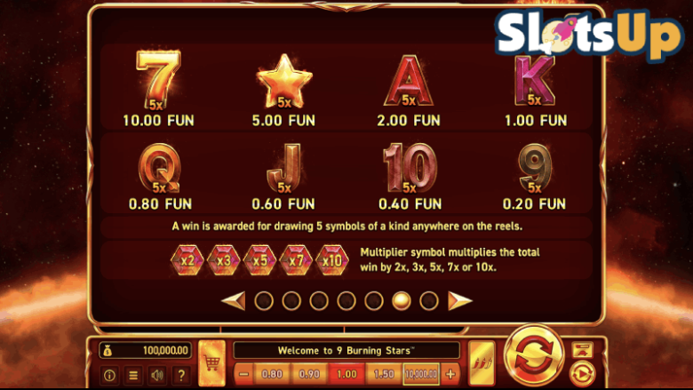 Wazdan har ikke inkludert noe ekstremt tematisk i 9 Burning Stars når det gjelder symbolene. Spillkortsymboler som starter på 9 og går til A representerer de første tilleggene. I tillegg kommer en stjerne og tallet 7, der sistnevnte gir de høyeste standardutbetalingene i spillet.